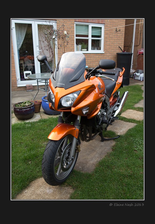 Last weekend we went over to Stratstone Triumph in Leicester to look at an ER6F and a Versys. I'd been training on an ER6F so it seemed sensible for my first bike to be one. The Versys was way too tall unfortunately, but they also had an orange CBF1000, and since I had sat on one three years ago and loved it, I had to sit on this one. Comparing the two bikes was no contest, so after a little bit of sensible thinking, I signed on the dotted line and the bike was mine. Fancy having a 1000cc bike for your first bike! I am getting quite a few incredulous reactions from people when I tell them this... but I am quite sensible really. Most of the time anyway. To get the bike home involved some personal sacrifice from Graham, as I couldn't ride it home as at that point I still didn't have a licence. Graham hadn't come prepared to ride, so he bought the cheapest helmet they sold and a pair of gloves and rode home with both our coats on.... Didn't work though, he was still frozen stiff when he got back!